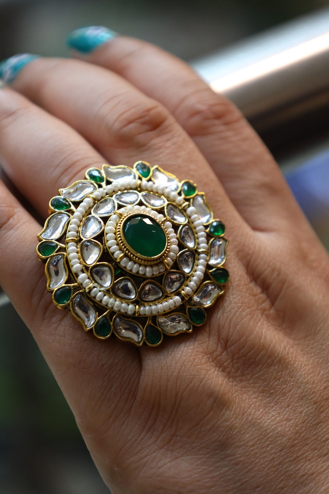 Heer – Kundan & Green Stone Statement Ring with Pearl Detailing