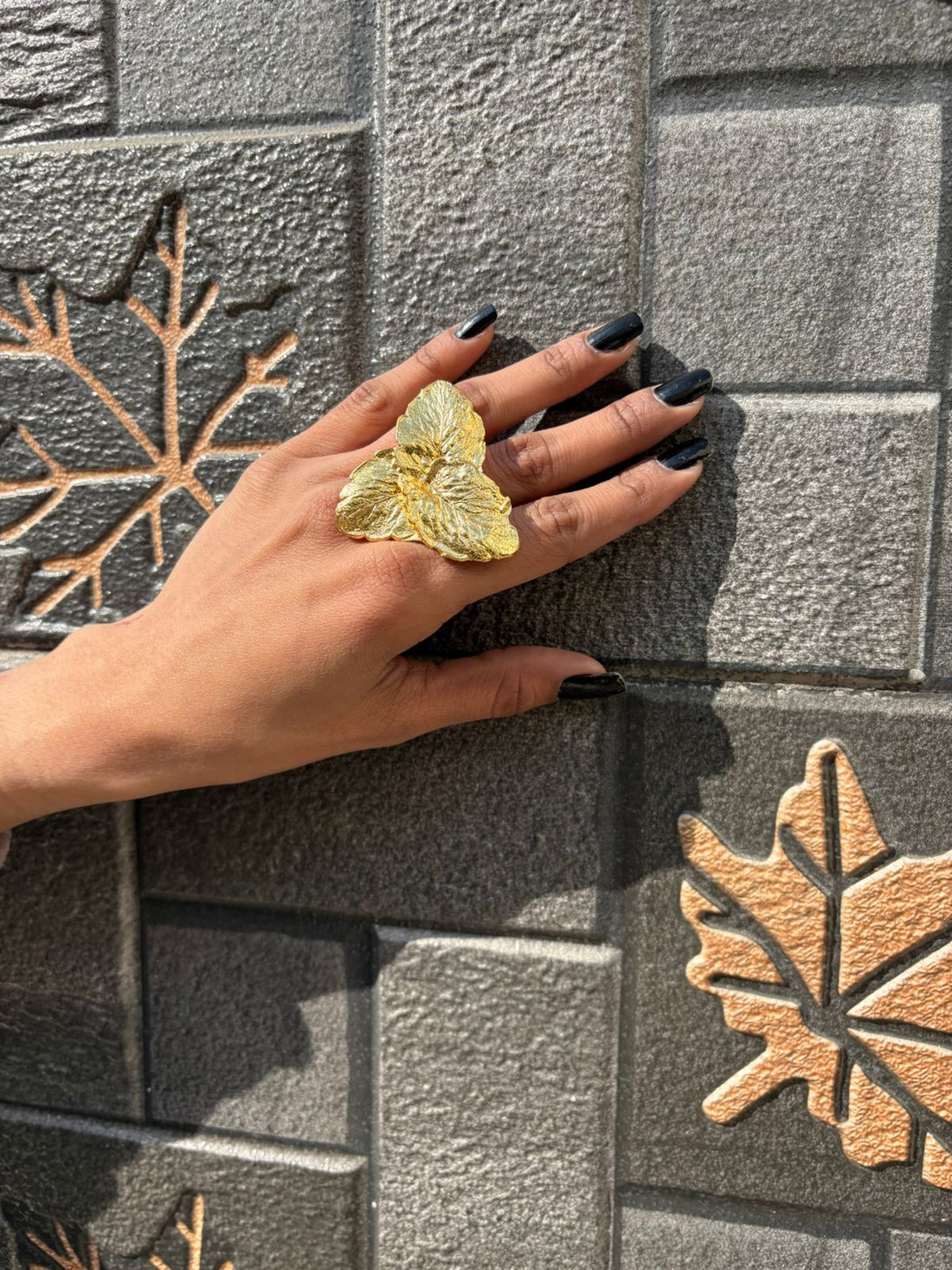 Make a bold impression with our Golden Bloom Leaf Statement Ring — a striking piece...