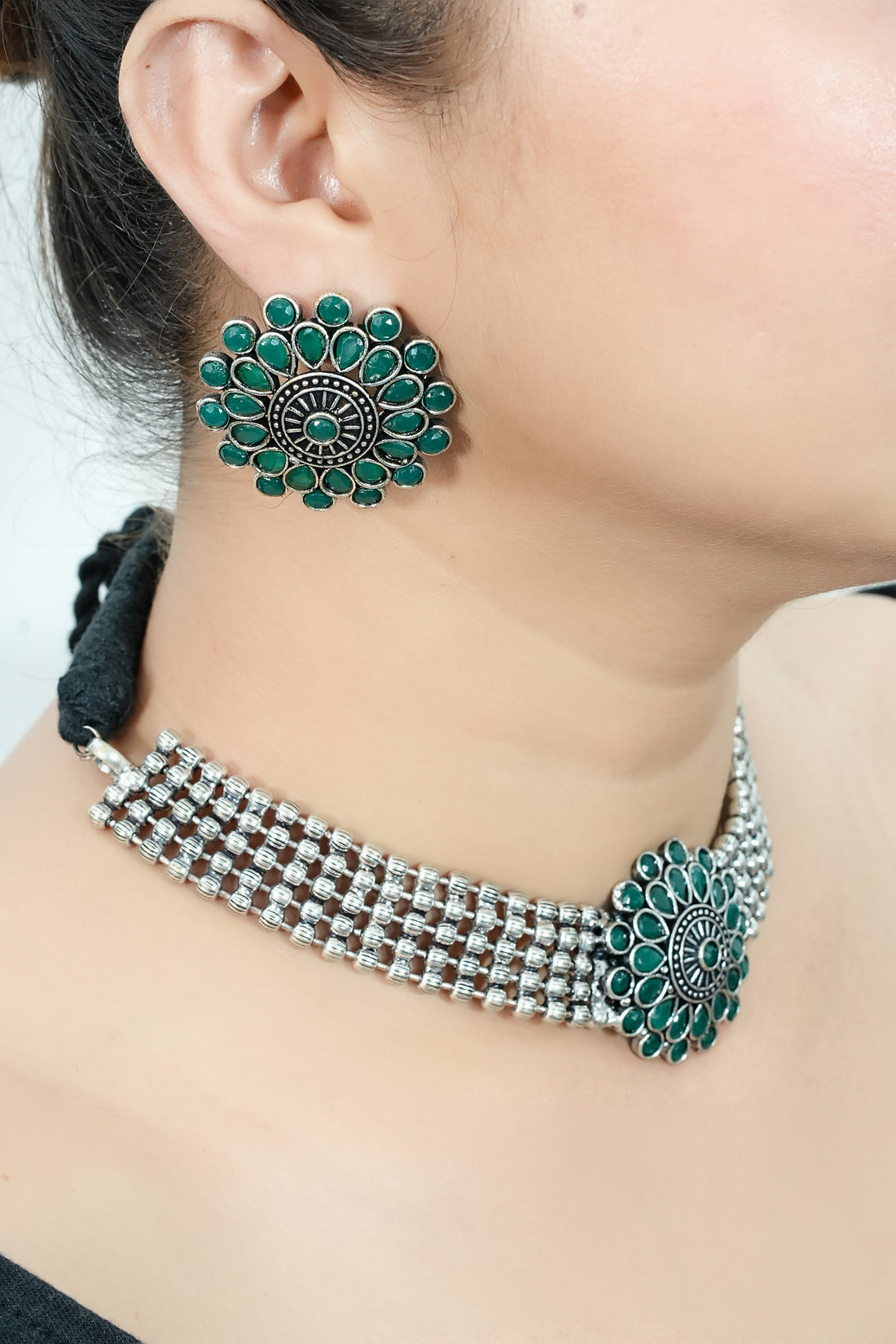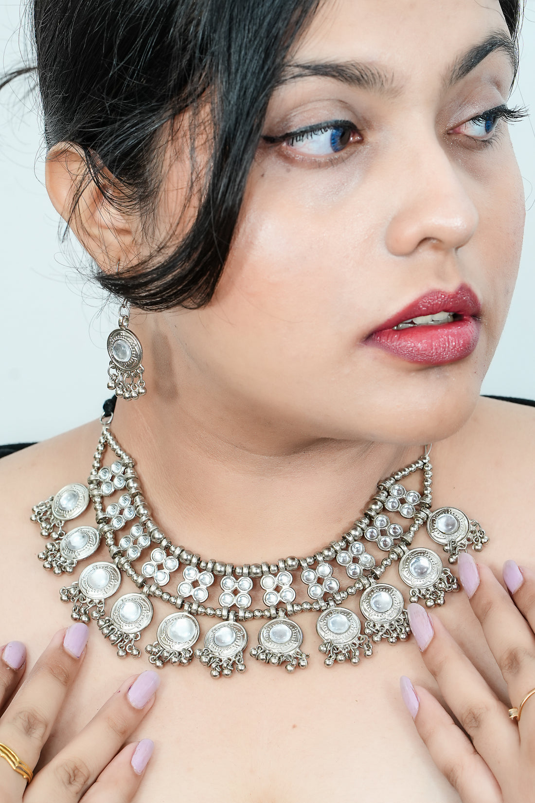 Let your neckline do the talking with the Mehfil Muse Oxidised Choker – Ruby Edition....