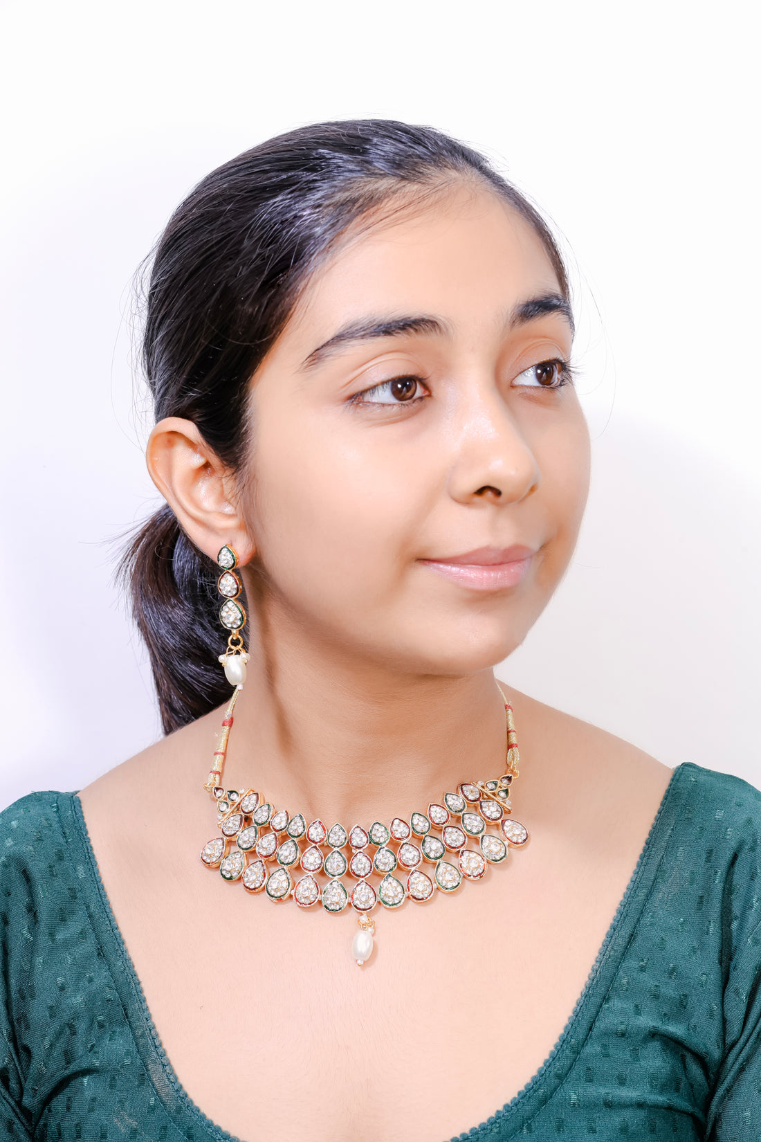 The Vedhika Set is an ode to timeless beauty. Crafted with layers of teardrop-shaped polki...