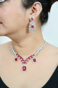 Introducing Aarohi, where modern grace meets royal richness. This stunning jewelry set features a V-shaped necklace and matching drop earrings, encrusted with deep ruby red stones framed by sparkling cubic zirconia.