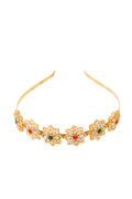 Let your hair do the talking with the Fleurin Headband – a royal blend of colorful elegance and traditional charm. Featuring intricately crafted floral motifs adorned with kundan stones and vibrant red and green center gems, this gold-toned beauty is a showstopper for any festive celebration or bridal moment.