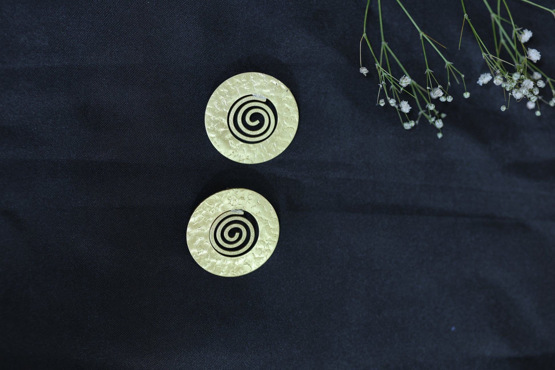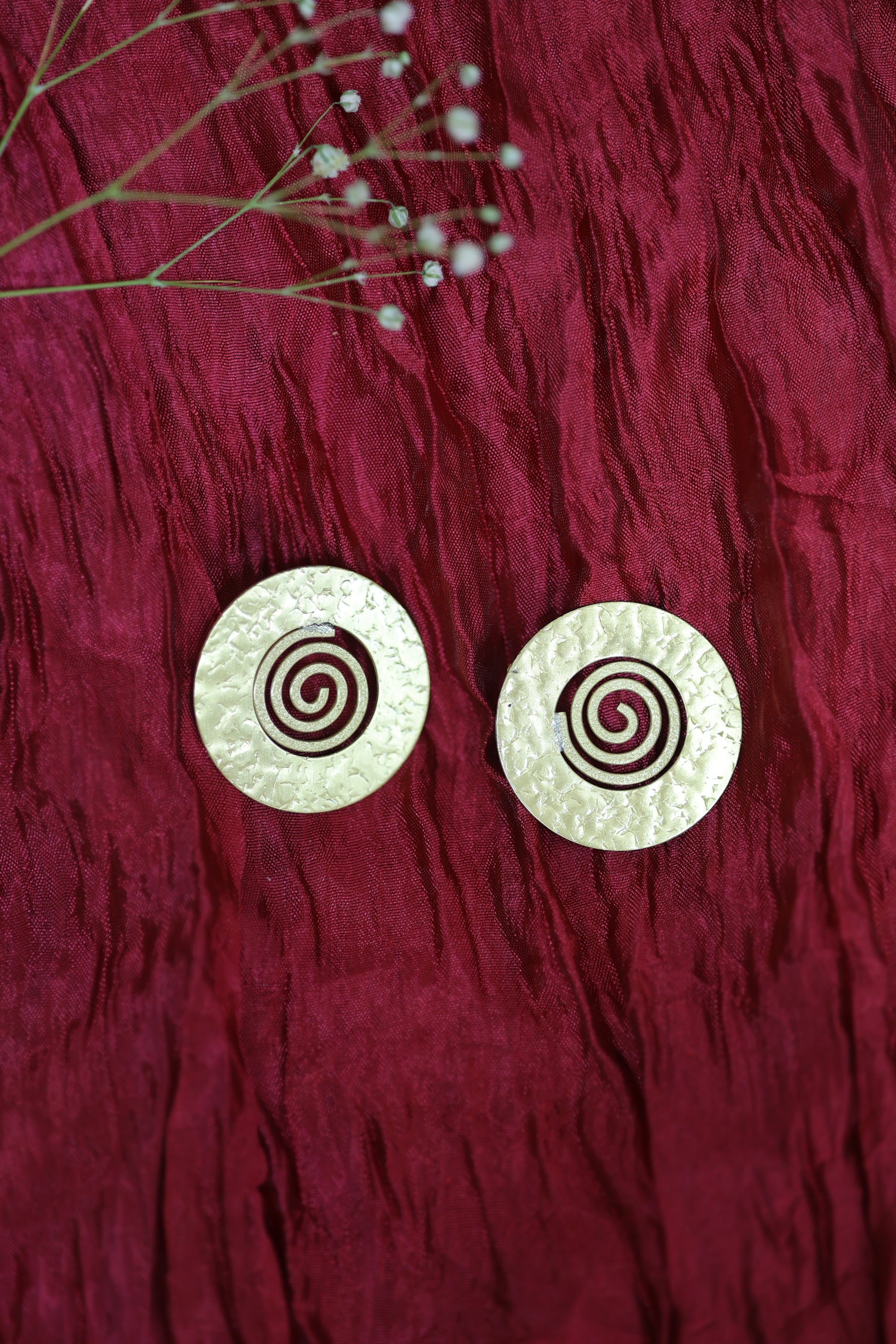 Bold meets boho in the Spiral Stud Earrings. These handcrafted circular studs feature an intricate spiral motif at the center, set against a rugged hammered gold surface for an earthy yet modern vibe. Lightweight and eye-catching, these add a statement to both ethnic and contemporary outfits.