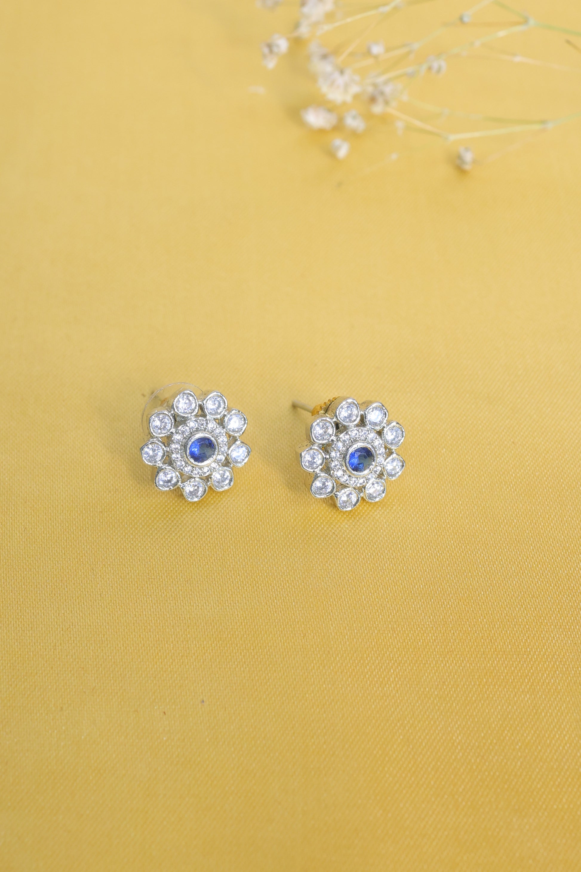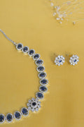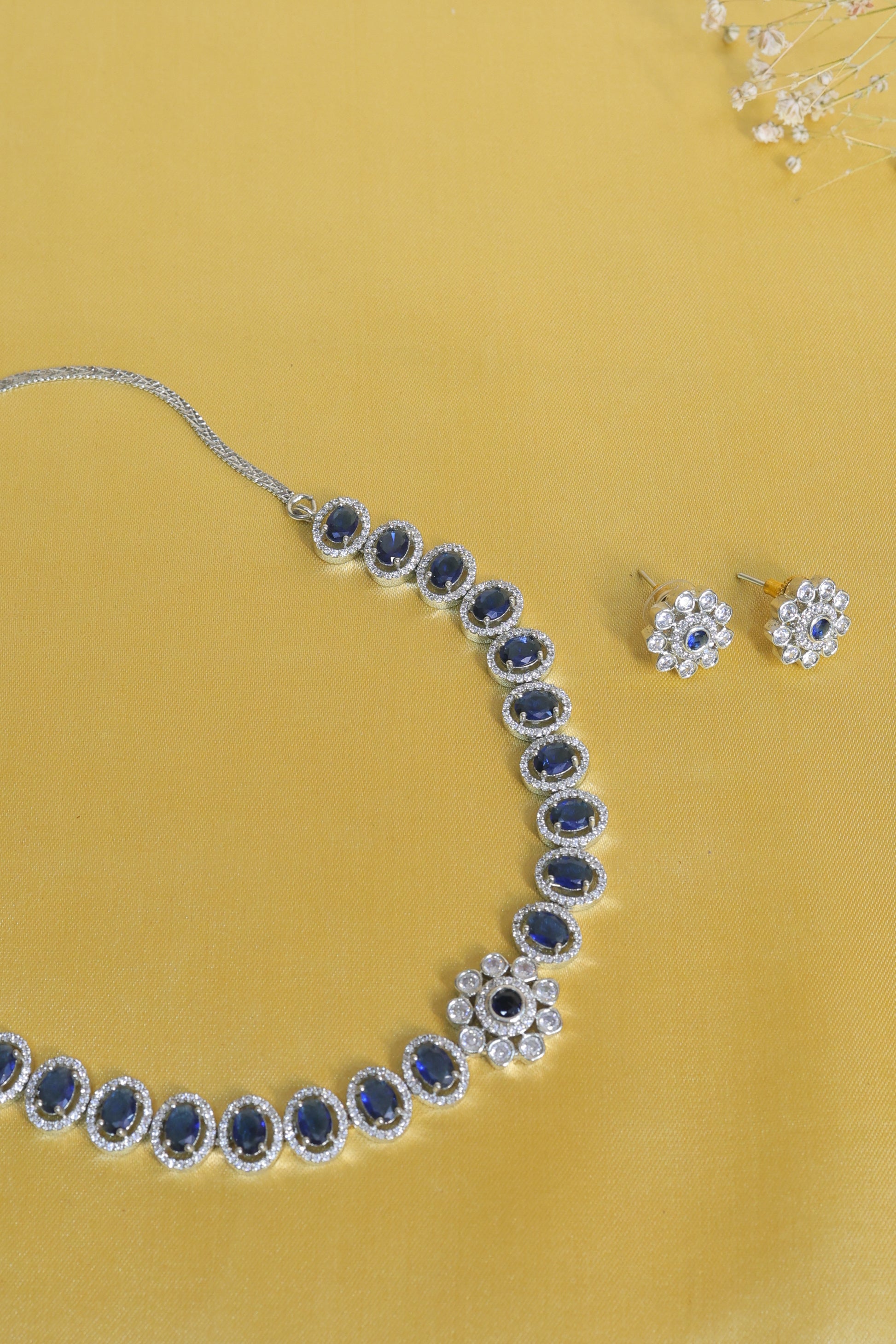 The Greer Set features a necklace of deep blue oval stones surrounded by halos of sparkling zirconia, paired with floral-inspired studs. Classic and refined, it's a regal finish to your evening or festive look.