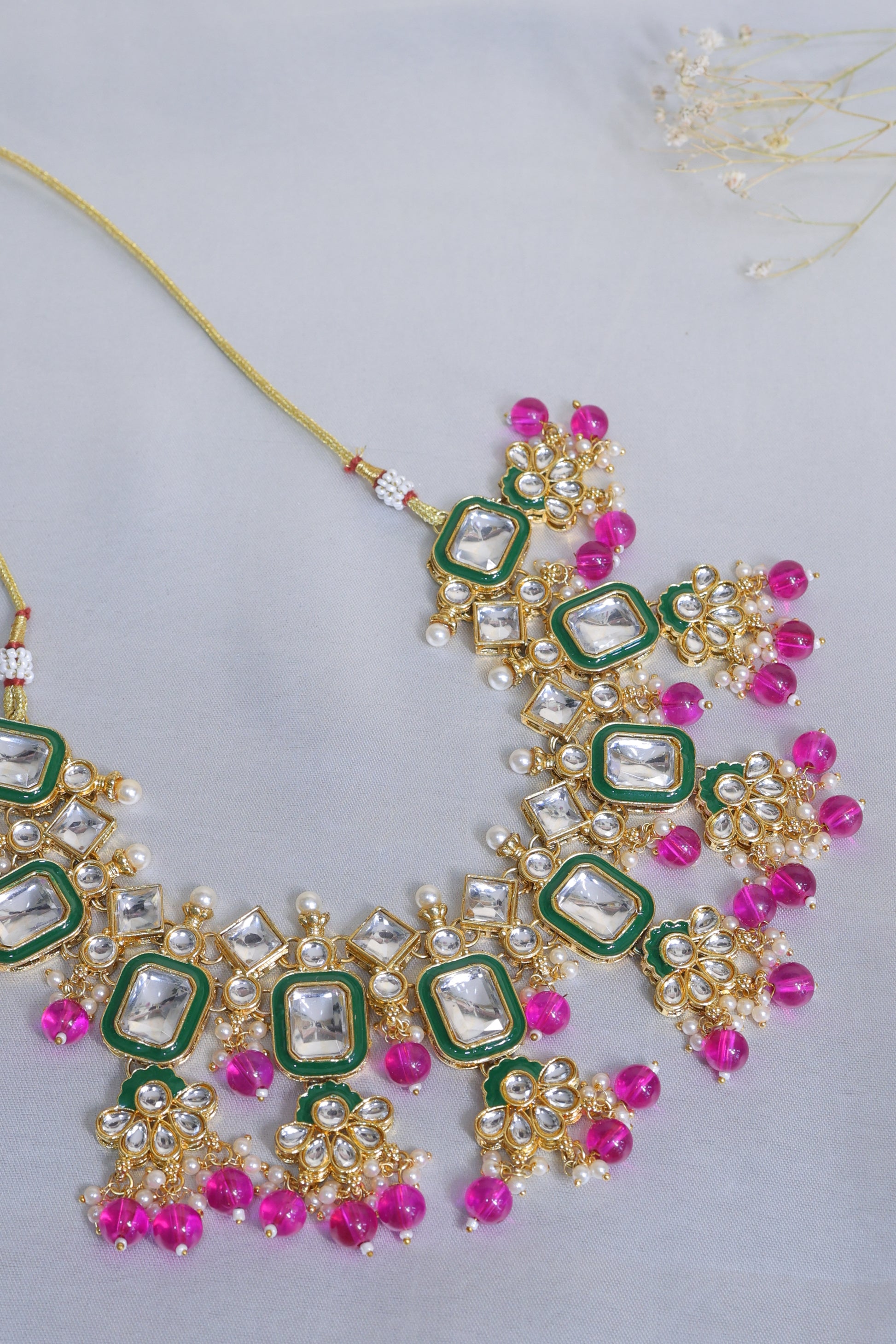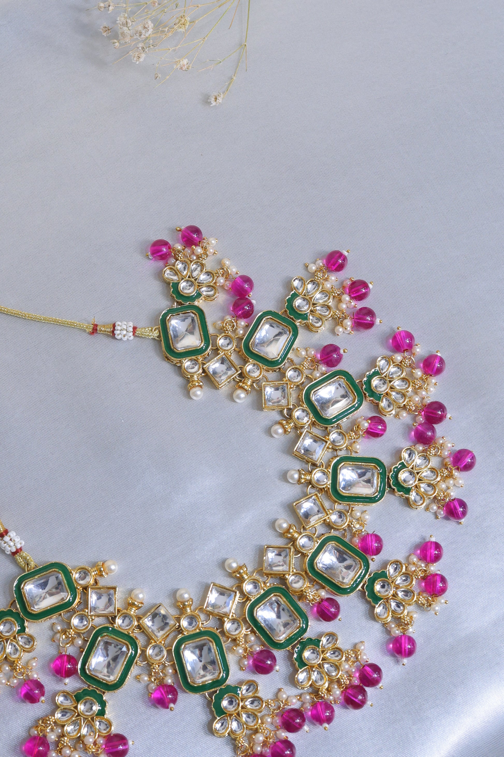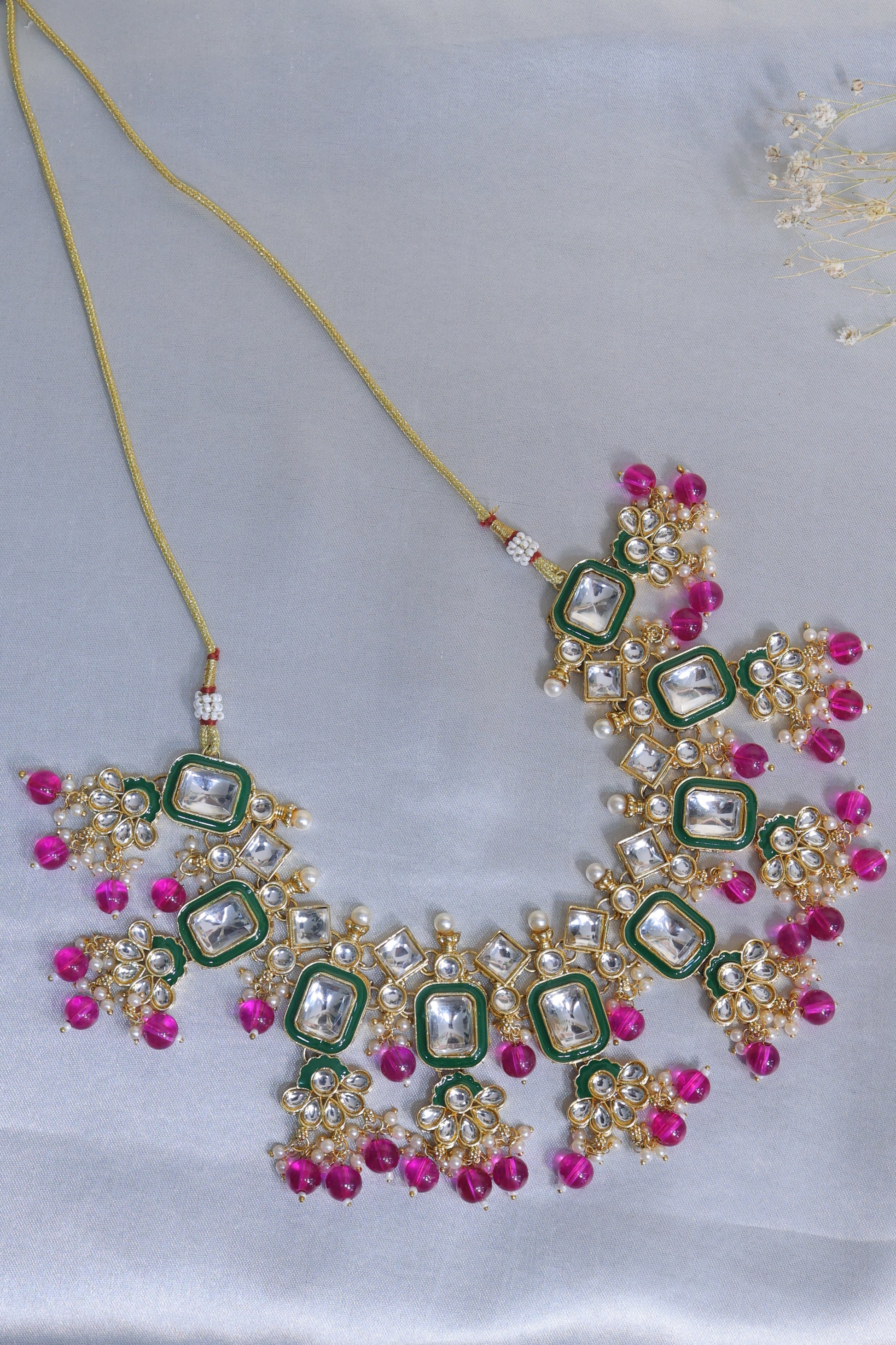 Gulnaar Royal Polki Choker Necklace Set with Green & Magenta Beads