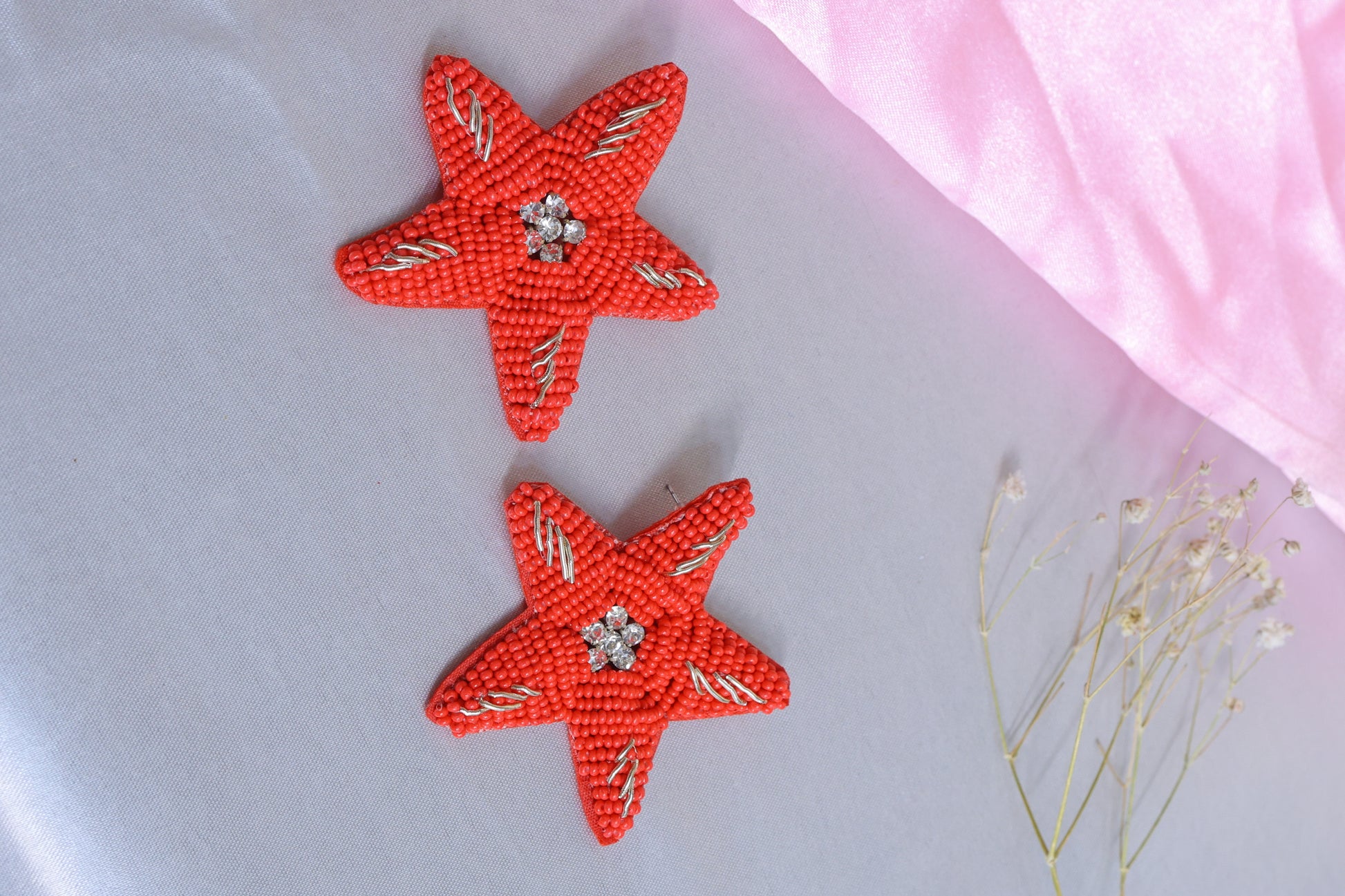 Add a pop of playful elegance to your outfit with these stunning handcrafted red star earrings. Intricately designed with micro red beads, shimmering silver threadwork, and a dazzling rhinestone centerpiece, these earrings bring the perfect fusion of tradition and modern sparkle.