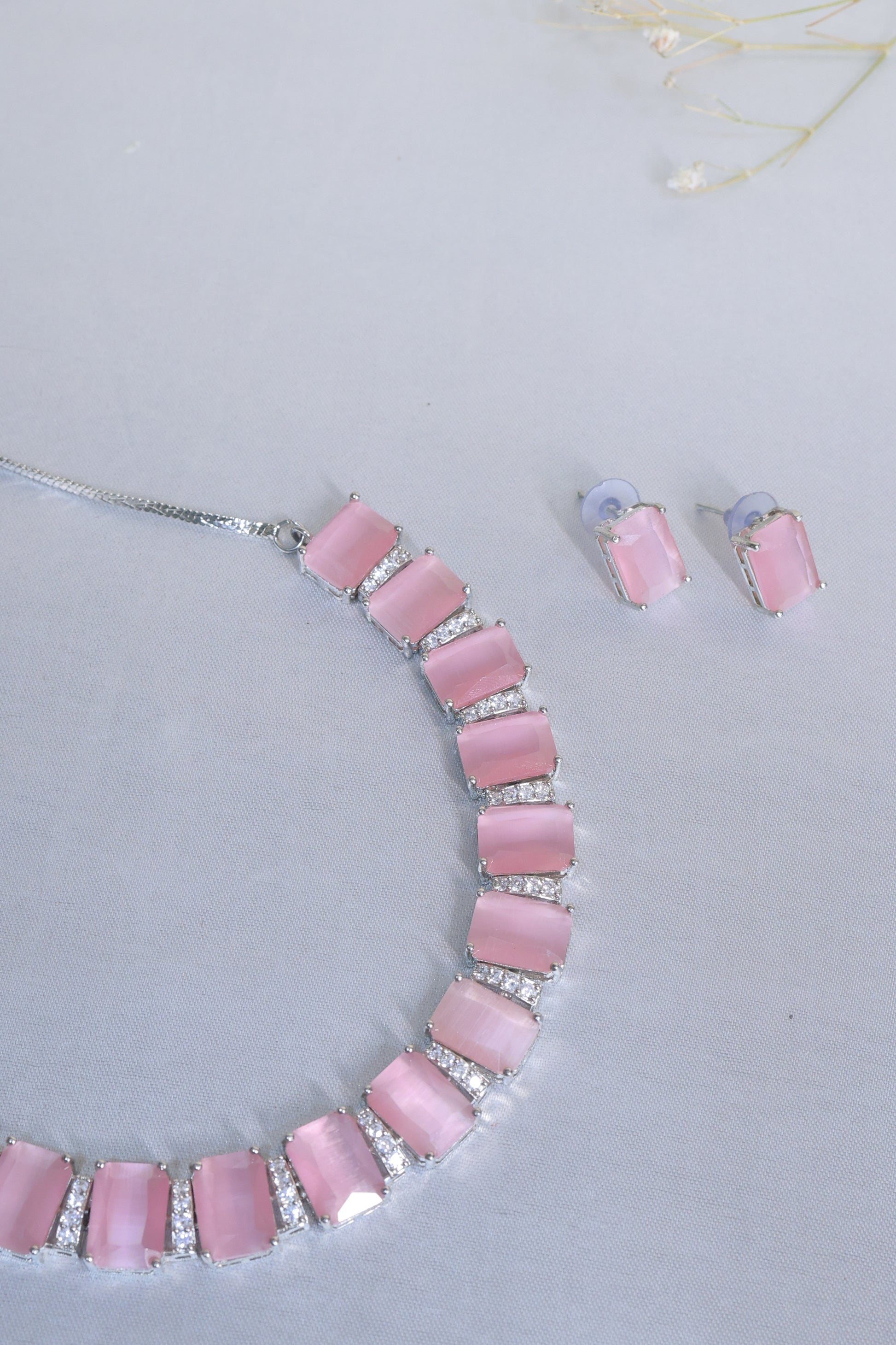 Soft, serene, and striking – the Mehira Set is a dream in blush pink. With its glossy emerald-cut stones and diamond-dusted accents, it adds the perfect pop of elegance to your wardrobe.
