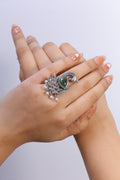 Evoke timeless charm with the Ophelya Ring, a handcrafted oxidised beauty inspired by nature’s elegance. The peacock-like motif is adorned with a deep green stone and delicate pearl danglers, making it perfect for adding drama and grace to your ethnic or fusion outfits. Let your fingers do the talking with this one-of-a-kind ring.