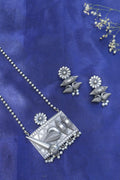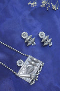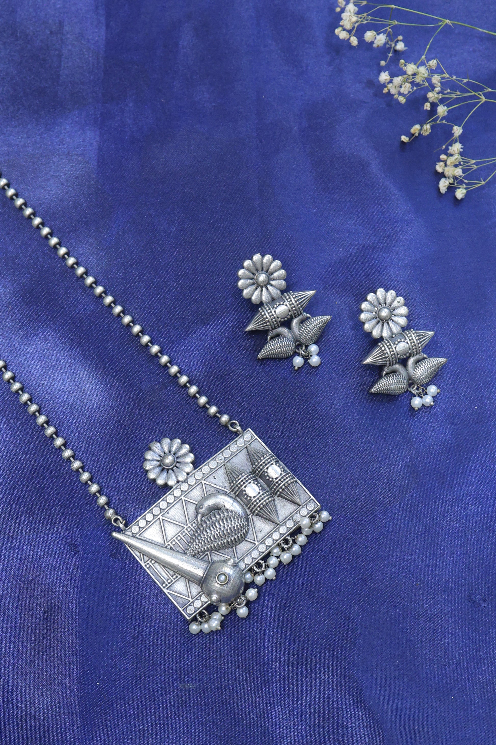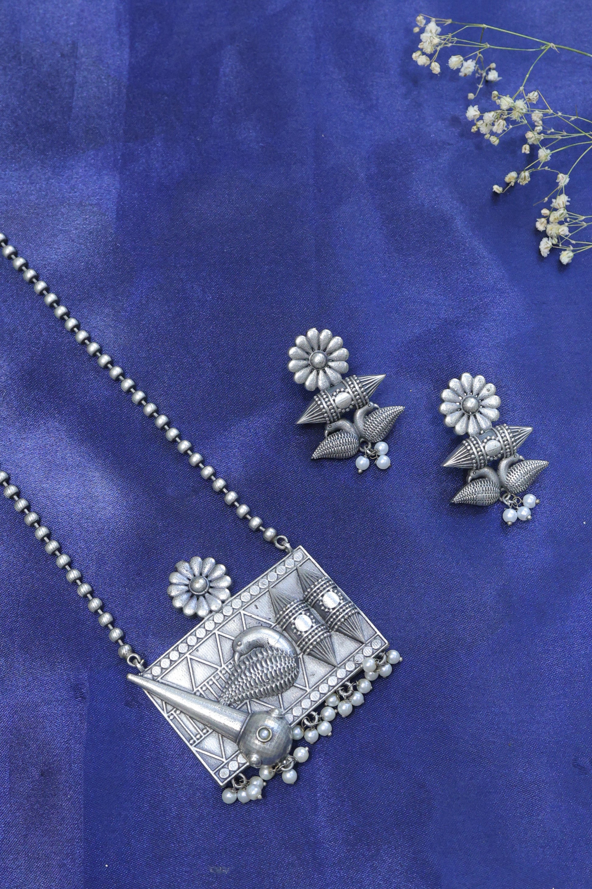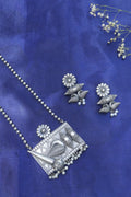 Rooted in heritage and bold in expression, the Tarini Tribal Temple Pendant Set is a statement piece that bridges tradition and artistry. The oxidised silver necklace features an intricate rectangular pendant with temple-inspired carvings, floral accents, and a bold spear motif, all finished with delicate ghungroo and pearl drops. Complete with matching earrings for a powerfully grounded look.
