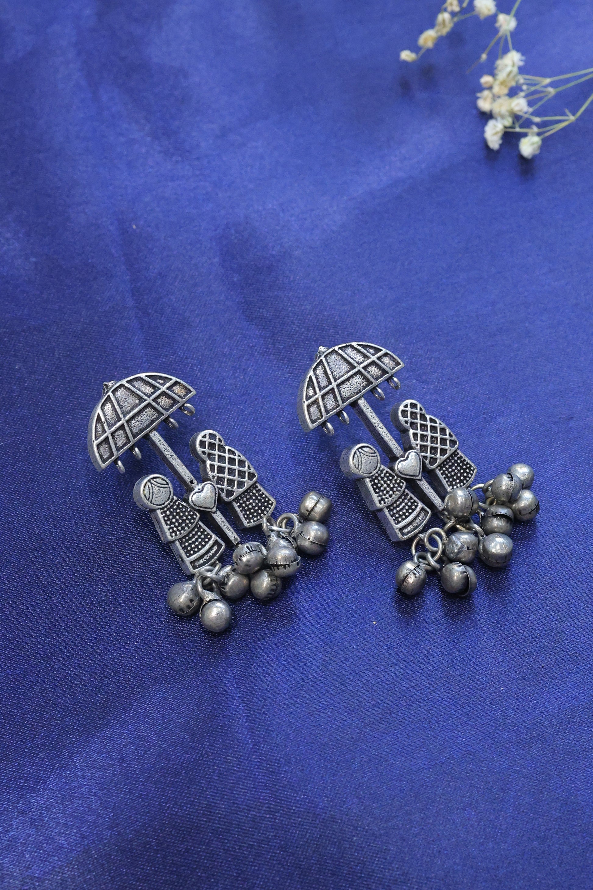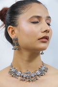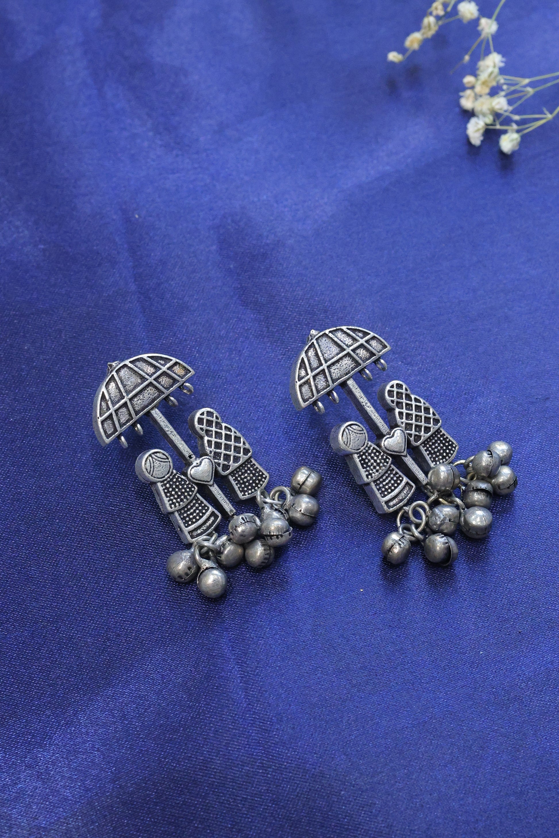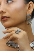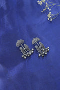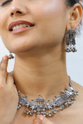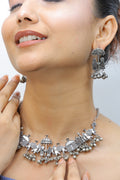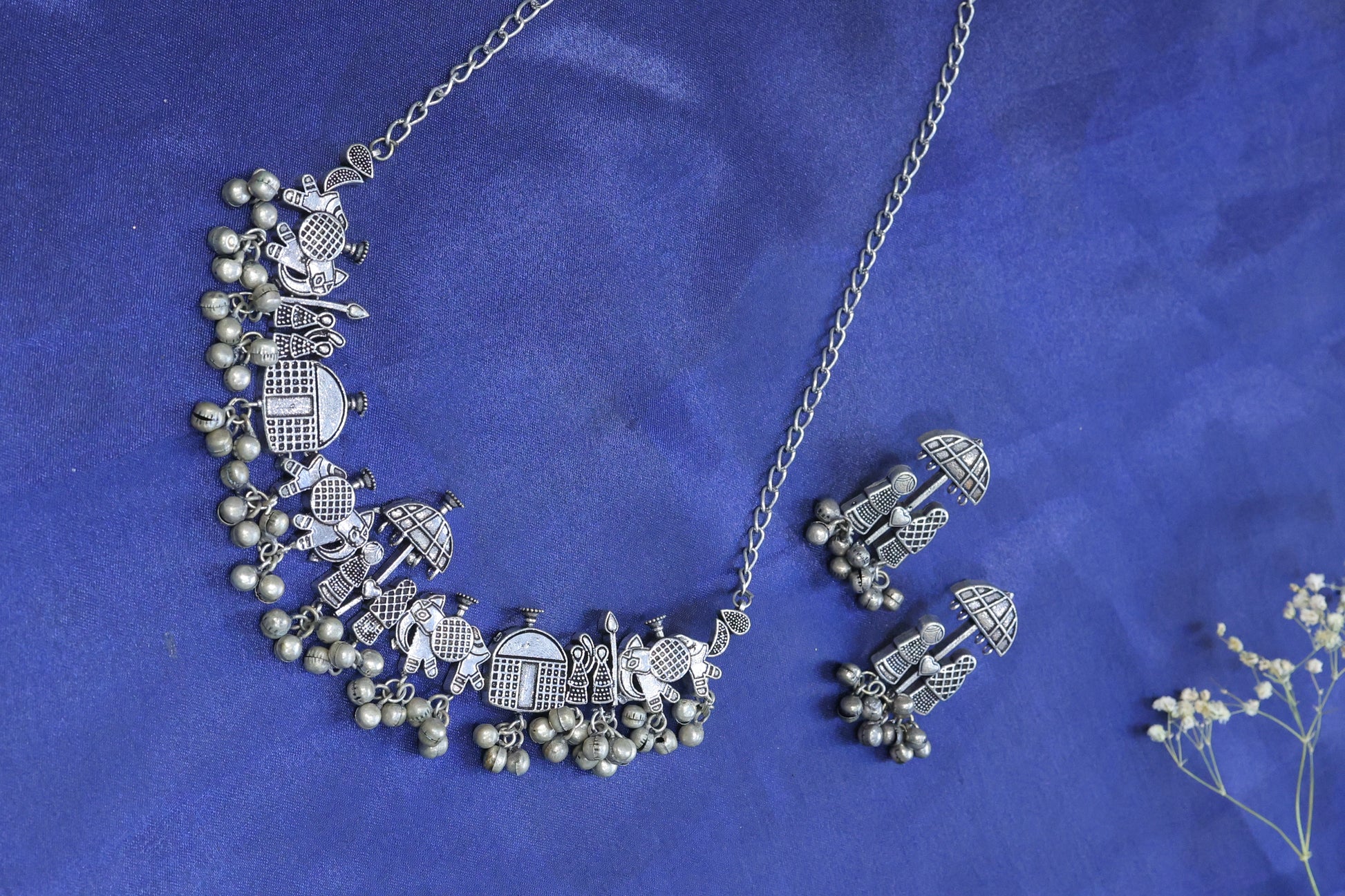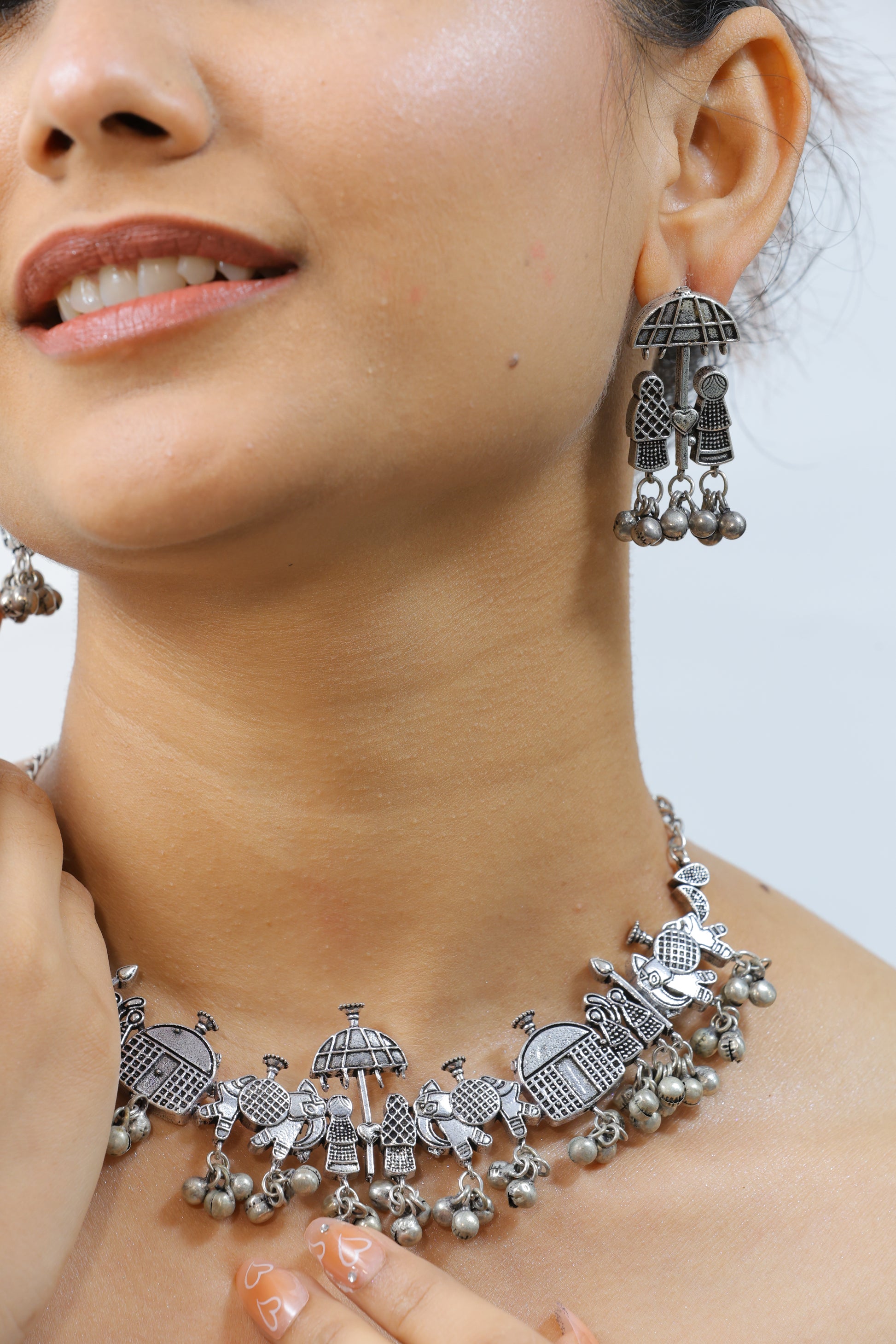 Celebrate tradition with a touch of drama in the Palki Bearers Oxidised Necklace Set — a beautifully detailed tribute to Indian folk artistry. This antique silver-tone set features intricately carved palki (palanquin) motifs, dancers, and temple elements, evoking a nostalgic charm of ceremonial grandeur.