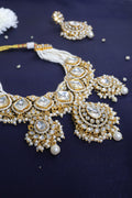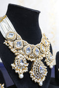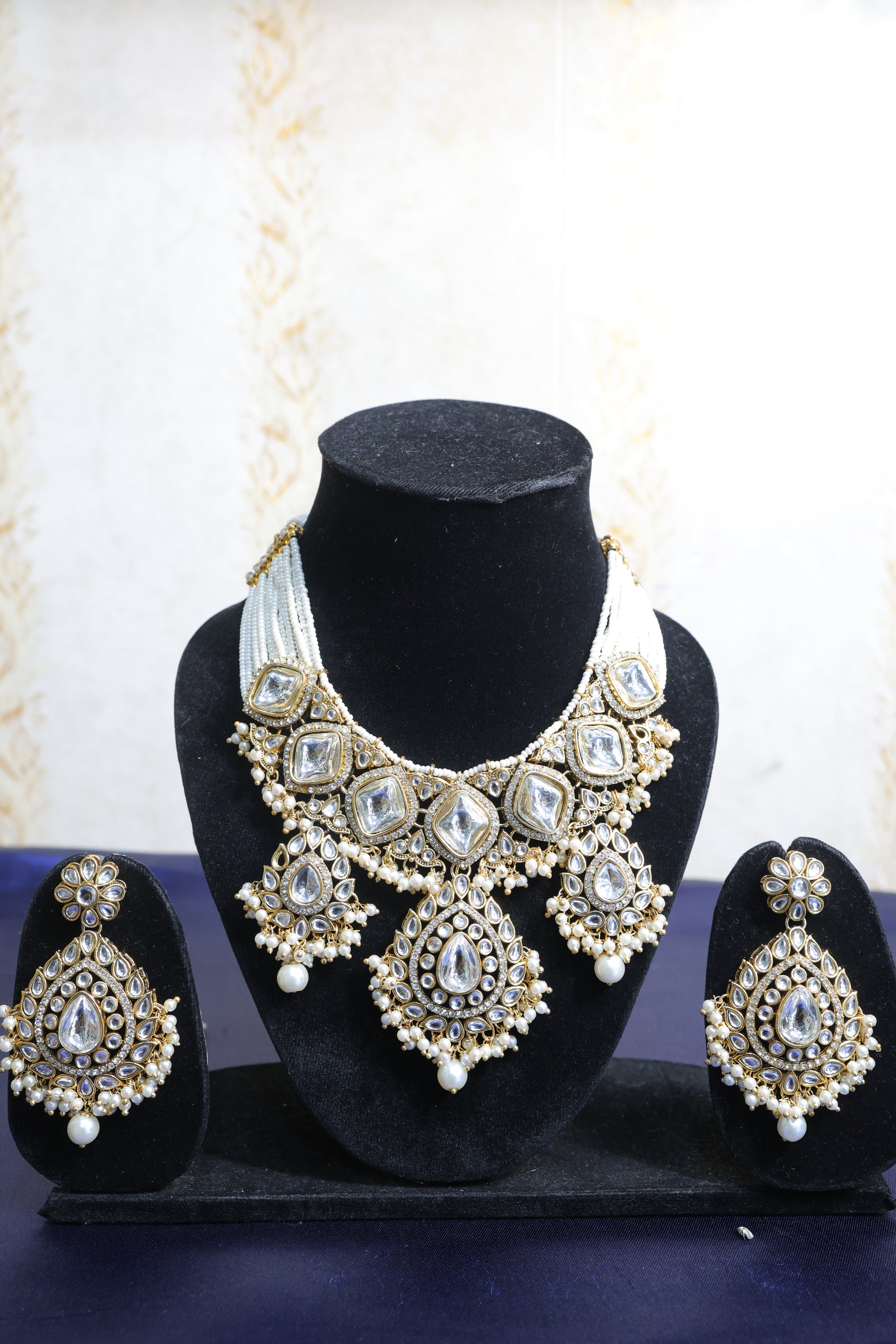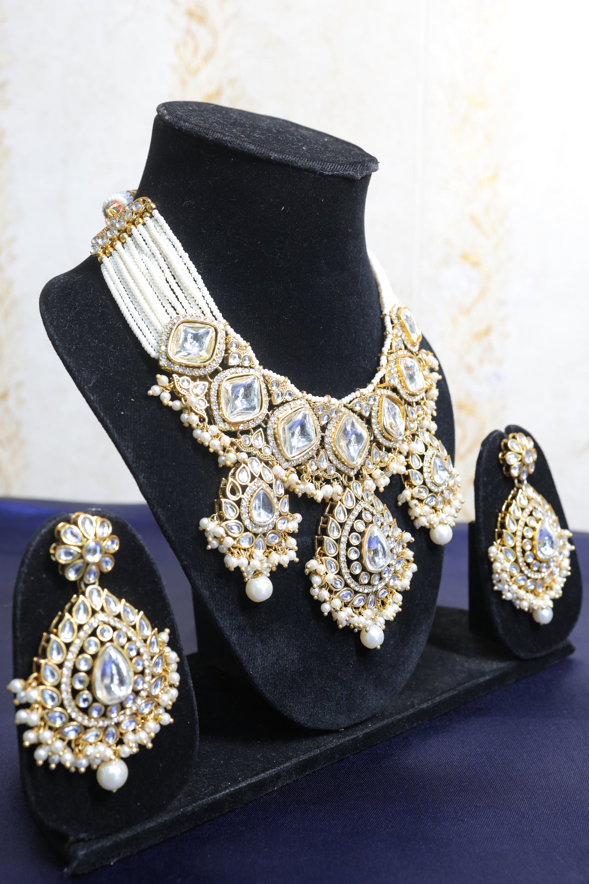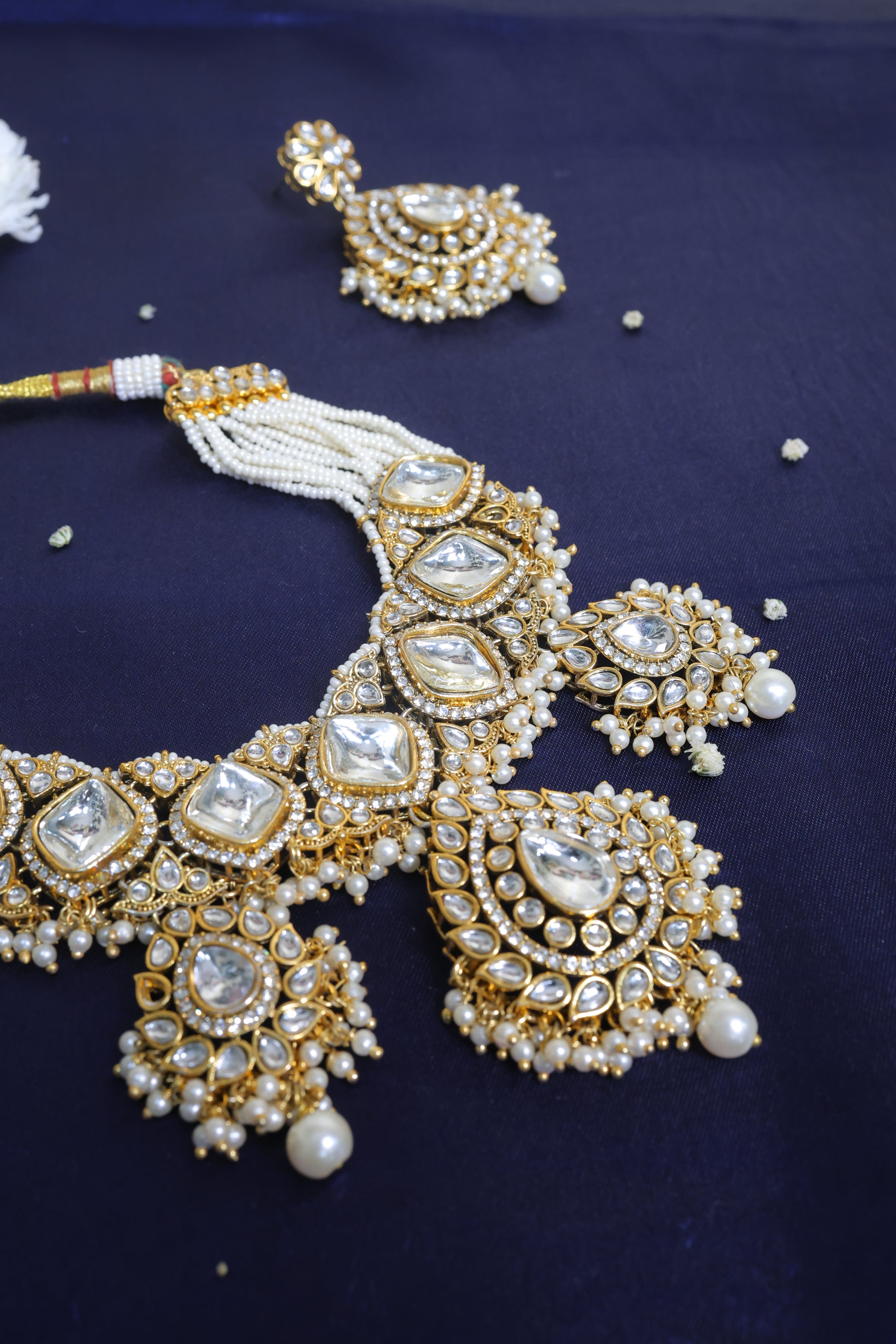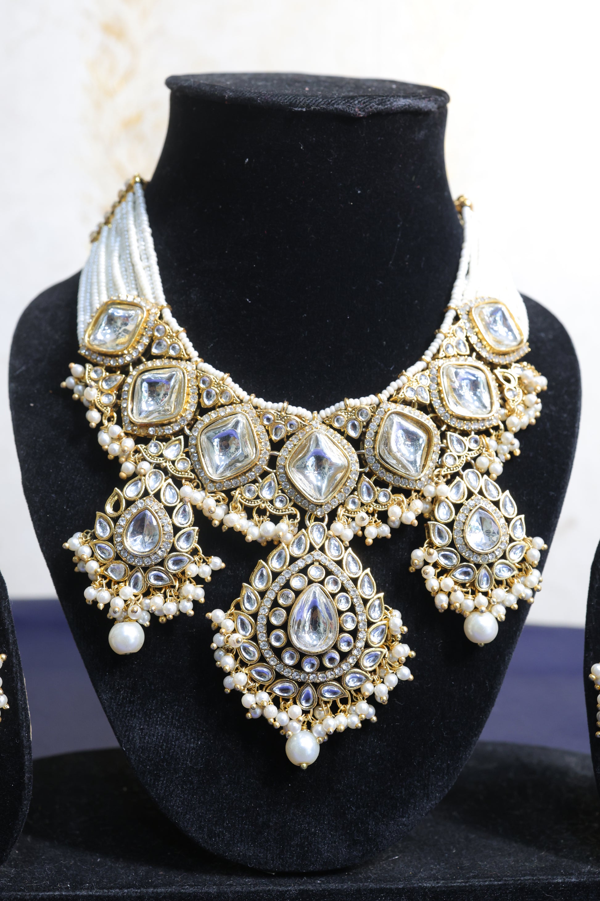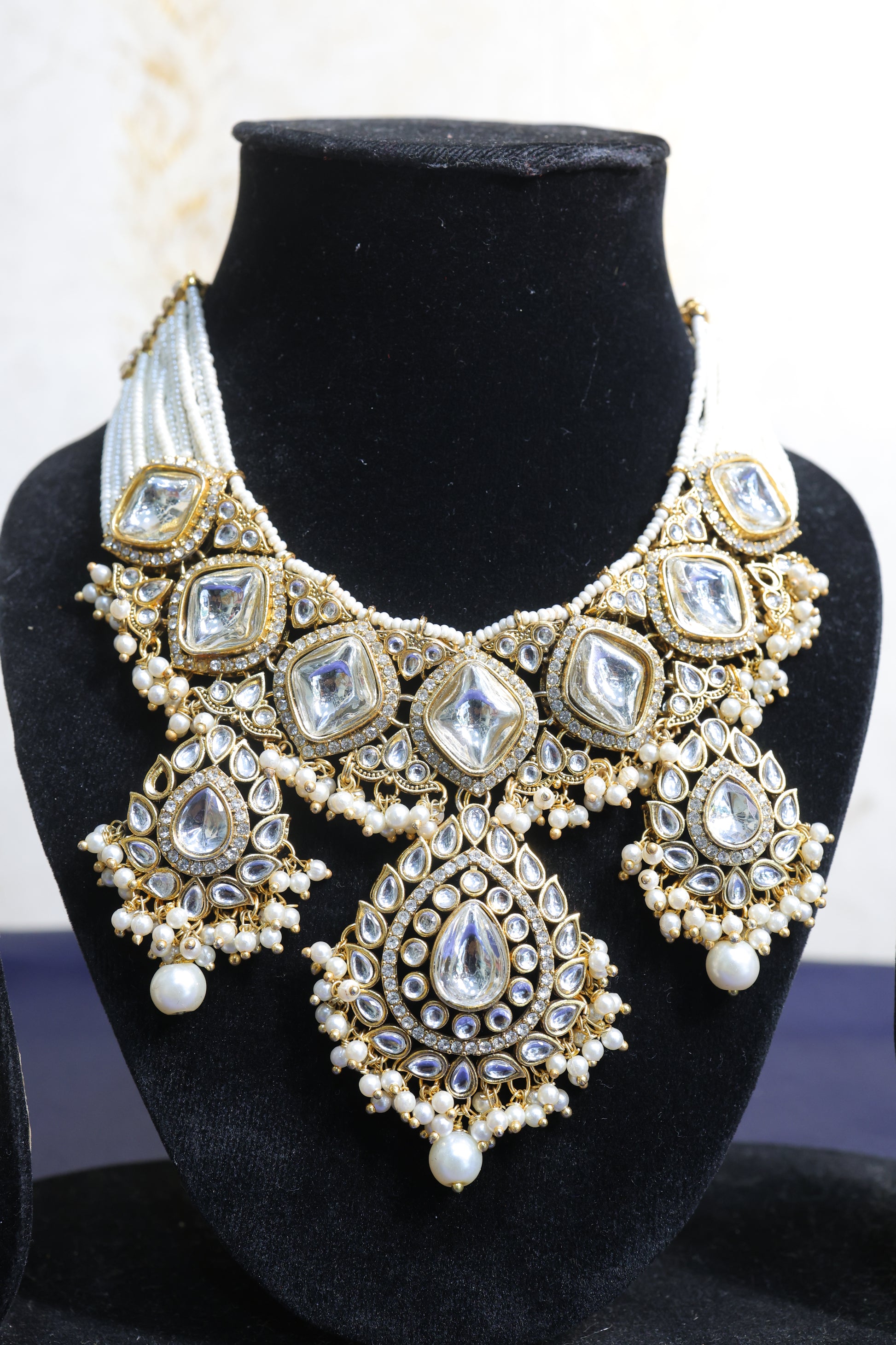 Step into timeless elegance with Swarna, a breathtaking Kundan jewelry set that celebrates traditional artistry with a modern twist. Handcrafted with precision, this regal ensemble includes a bold statement necklace, intricately designed earrings, a layered bracelet set, and a coordinating ring — each piece encrusted with premium polki stones and delicate pearls.