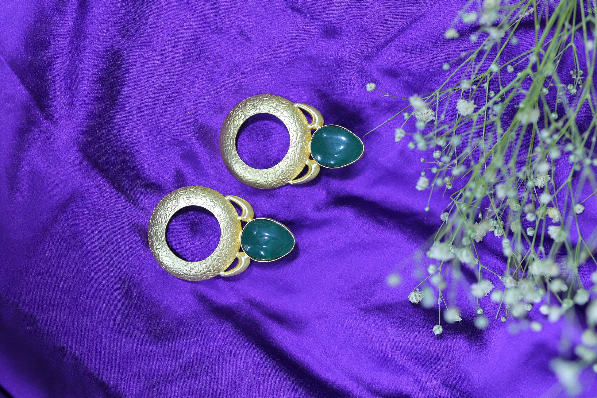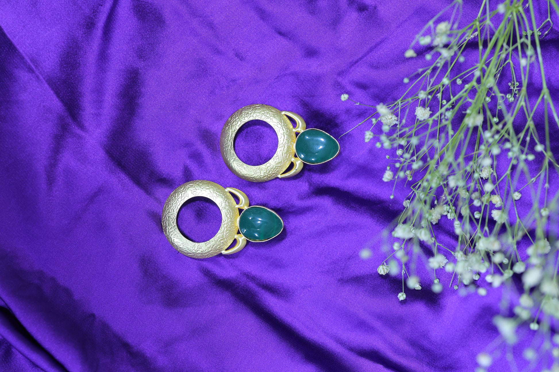 Add a dash of vintage royalty to your look with the Royal gold plated brass Earrings. Featuring a striking teardrop-shaped green stone paired with a circular embossed gold-toned base, these earrings fuse heritage design with modern elegance. The intricate detailing and bold silhouette make them perfect for festive outfits or a statement day-to-night transition.