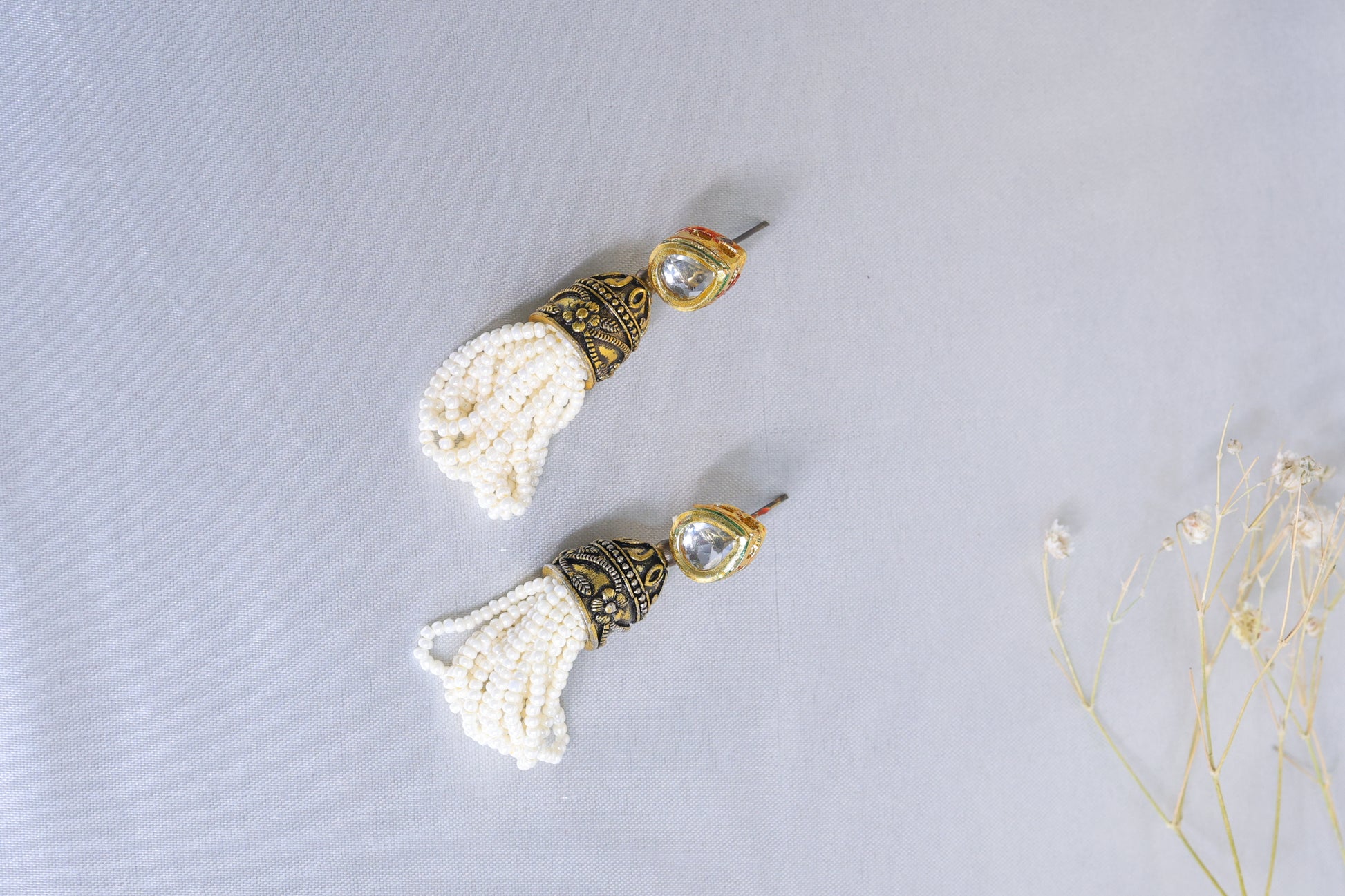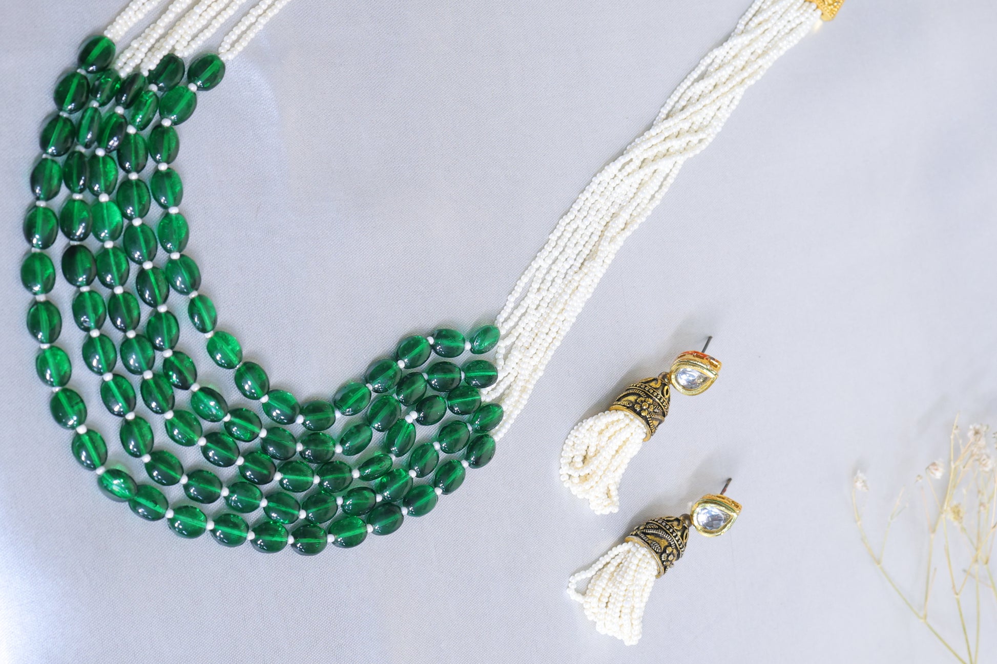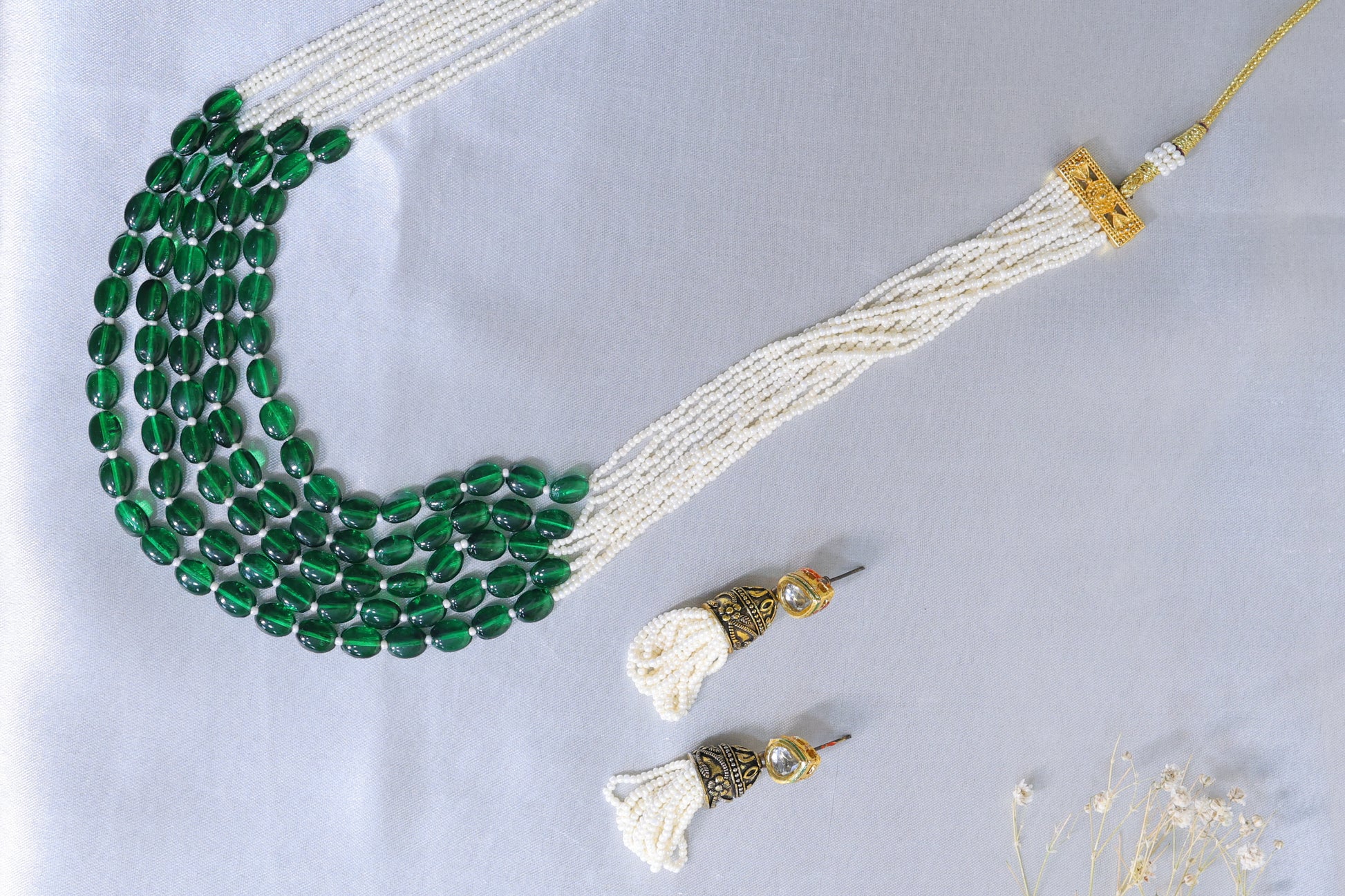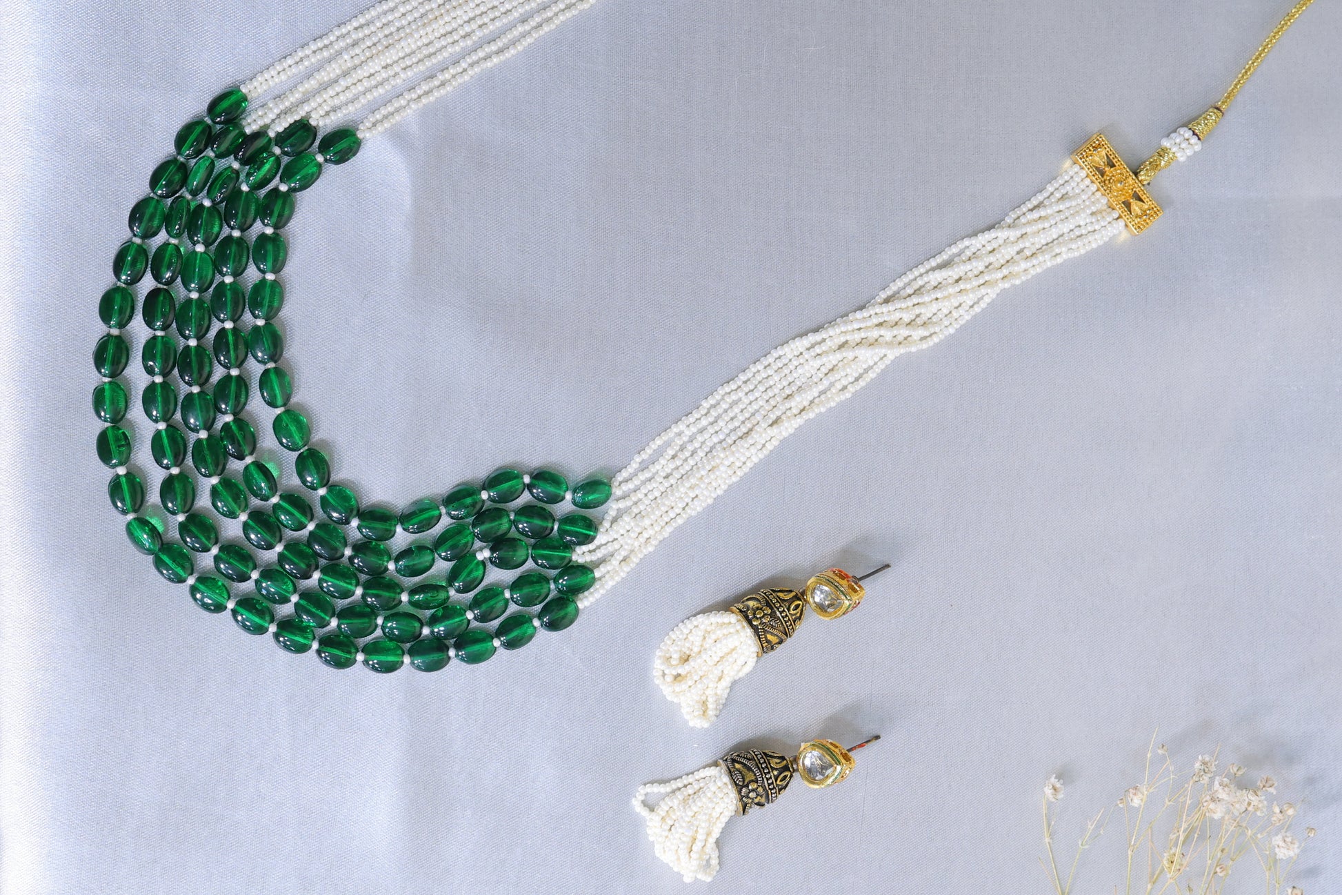 Channel effortless elegance with the Veloura Boho Royal Beaded Layer Set. Featuring layers of deep green glass beads paired with delicate white seed pearls and antique-finish gold caps, this necklace radiates natural grace. Paired with oxidized dome tassel earrings, it’s a fusion of tribal soul and regal polish.