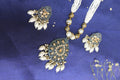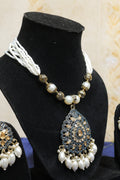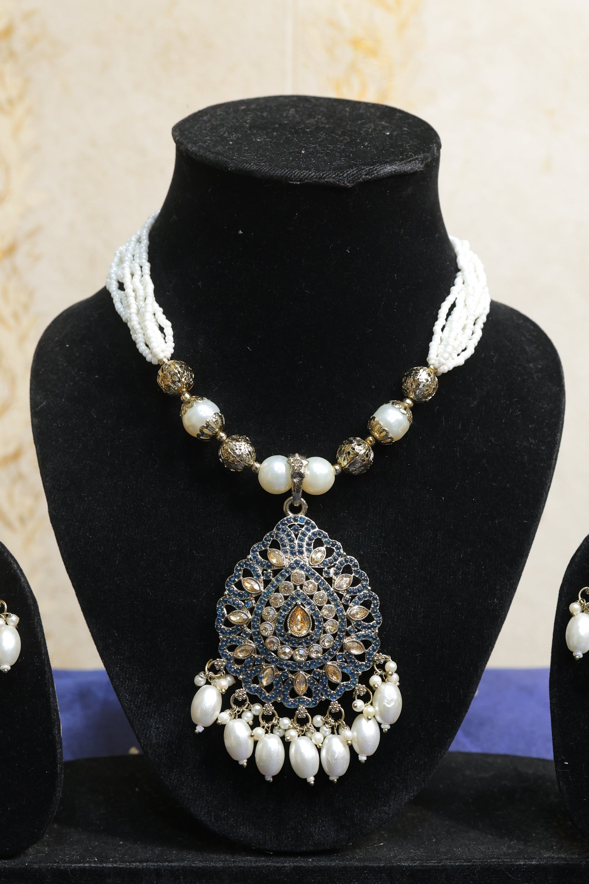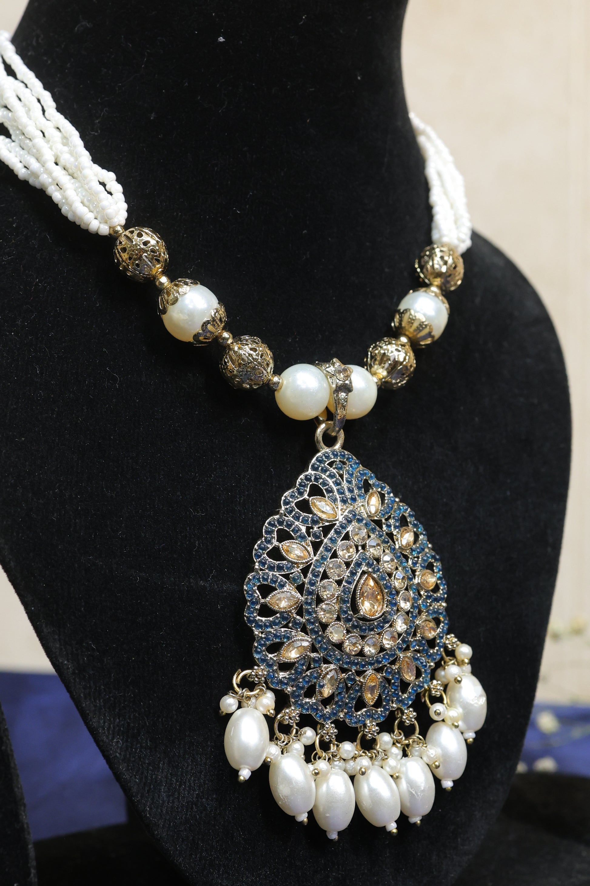 Grace meets heritage in the Zarkhira set. A teardrop-shaped meenakari pendant in rich royal blue, accented with antique gold work and dangling pearls, sits on a bed of layered white beads. Paired with dramatic jhumka-style earrings featuring pearl clusters, this set effortlessly blends tradition with statement style.